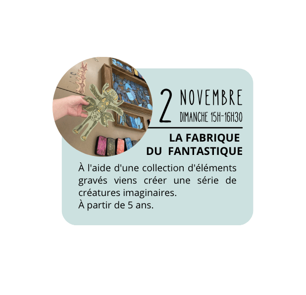 À l'aide d'une collection d'éléments gravés viens créer une série de créatures imaginaires. Atelier d'impression de gravure en taille d'épargne d'une heure et demi.